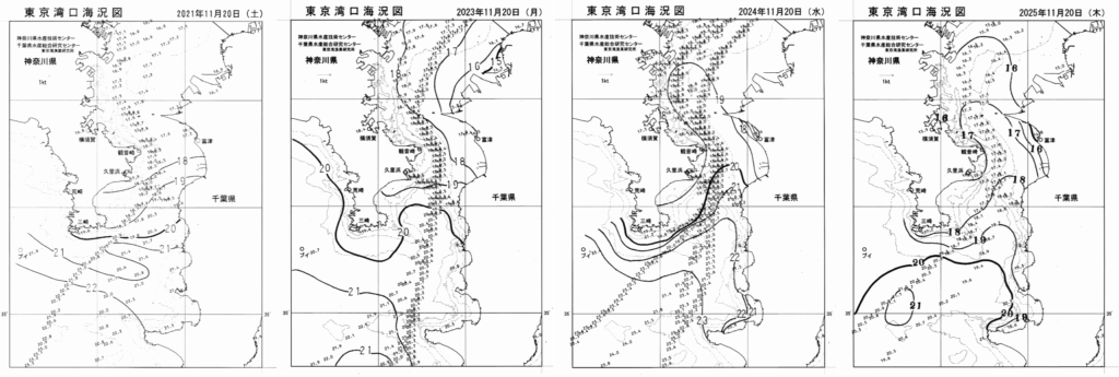 海水温を調べてみると、2021~2025年で見ても海水温の傾向とアジのサイズの相関はとれない。