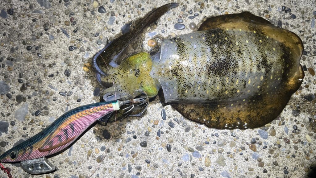 片付けの最後のタックルはエギング。ラスト3投ルールでトライすると、いきなりバラすも反応があった。