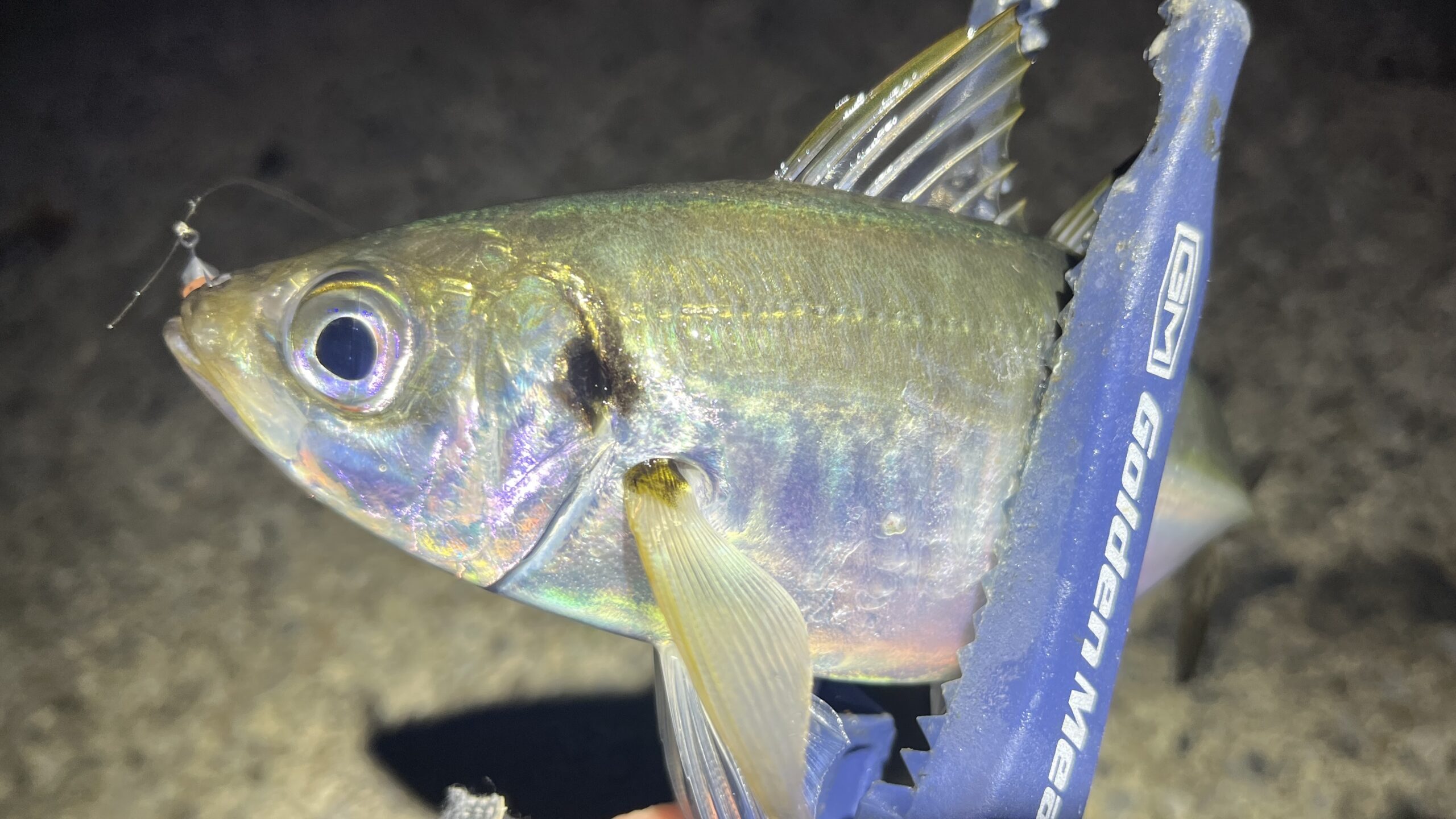 この日は様々なアジの群れが入ってきたり出ていたたりしている印象で、時にはジグヘッドを飲み込む活性の高い個体も混じる。途中、太刀魚が夜光虫で目視でき、Nさんがタチウオテンヤを再開ししっかりキャッチ!僕も探るも反応は得られなかった。