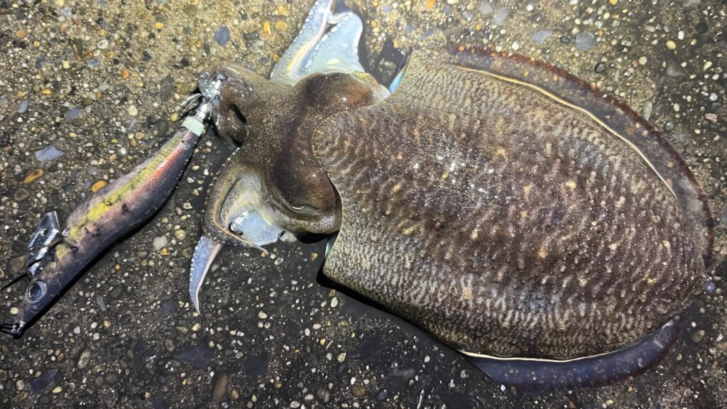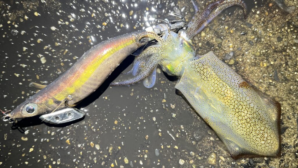 浅瀬は然程潮が流れていないので深場でエギを流す事に。開始して1時間以上生命反応を感じない中、TKさんの子どもと話をしながらダラダラやっていたら、ようやくヒット!