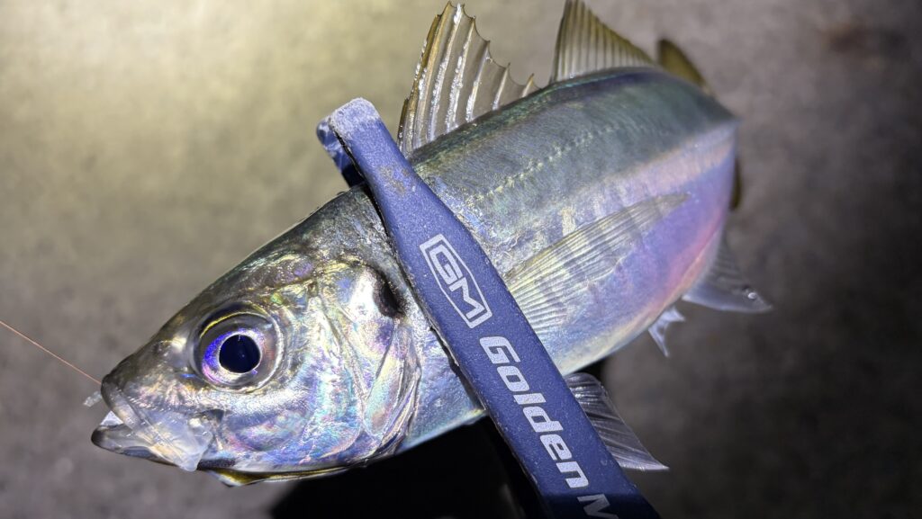 開始早々にボトム付近でアジングでもっとも気持ちの良い、コン!とあたり釣り上げたのは良型のアジ!