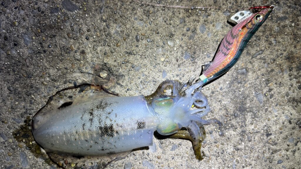 すると1投目から即反応あり!え!?いいじゃん!サイズは赤ちゃんだけれども今日のエギングに期待が膨らむ。