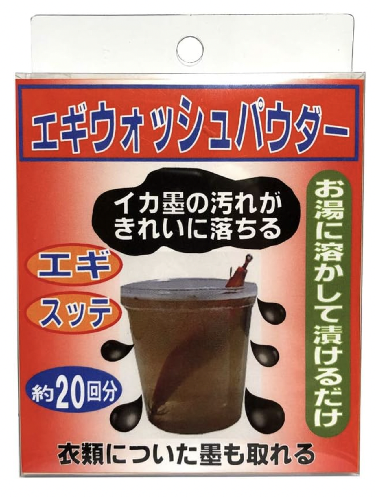昨年、Yさんのアオリイカにスミをかけられた時に、Yさんからいただいたエギウォッシュパウダーを使ってつけ置きしてみたら、綺麗にスミが取れた!