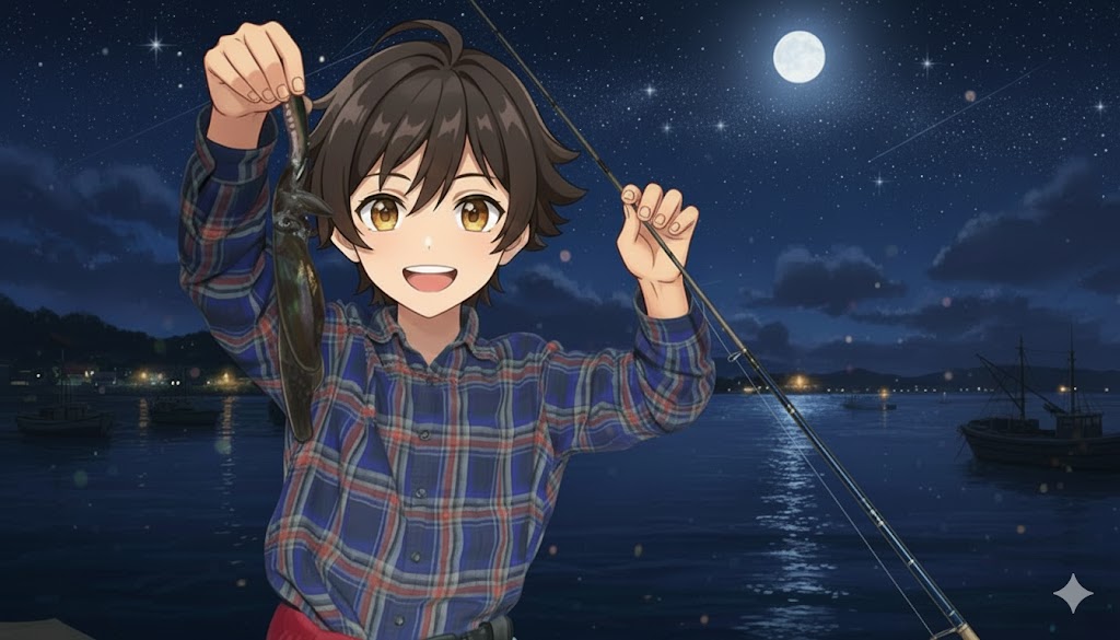 また、Geminiで釣果写真を加工。まずはシーンを田舎の港にしてもらいイラスト化。いまひとつだったので、「深海誠風」にしてもらい、顔は子どものリクエストで「原神」風にした。うん、悪くない!