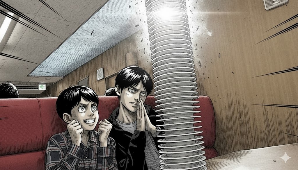 今回は「進撃の巨人」テイストでGeminiに加工してもらった。次男の手とかポージングが勝手に変更されてたりしたものの、なかなか雰囲気出てる。笑