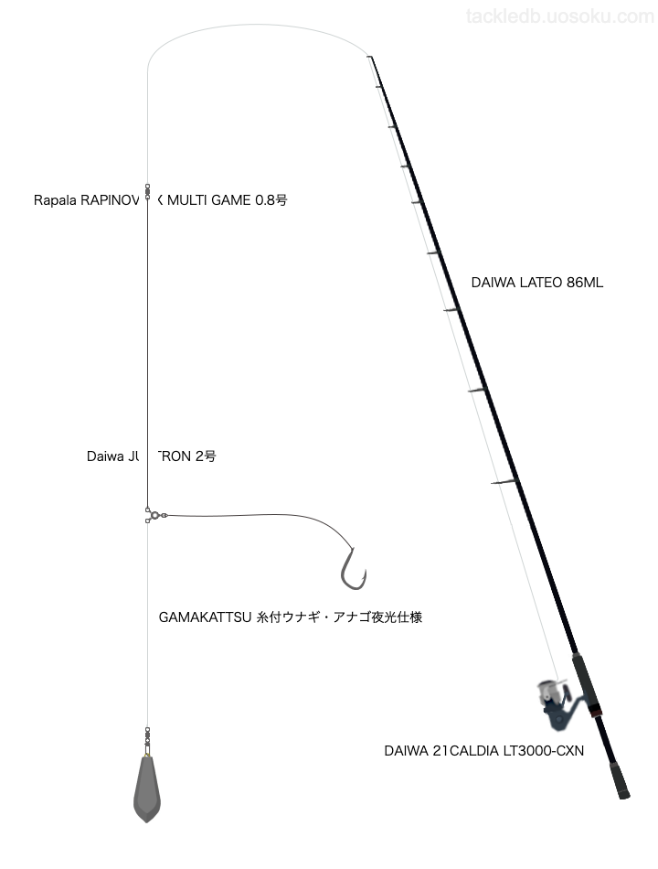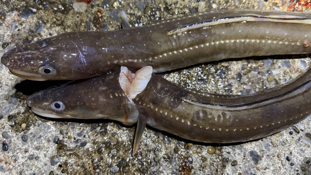 そして、2回目はなんと、アナゴを抜き上げたドラグセッティングのキツい状態のままでヒットさせるもバラしてしまう。運よく針は無事だったので、次は背中に針をセットした形でチャレンジ。