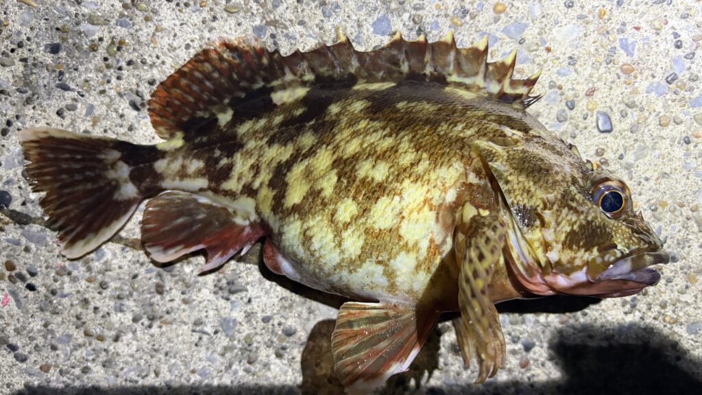 この日はカサゴの活性が高く20cmオーバーが3匹。うち1匹は24cmの腹パン魚体だった。