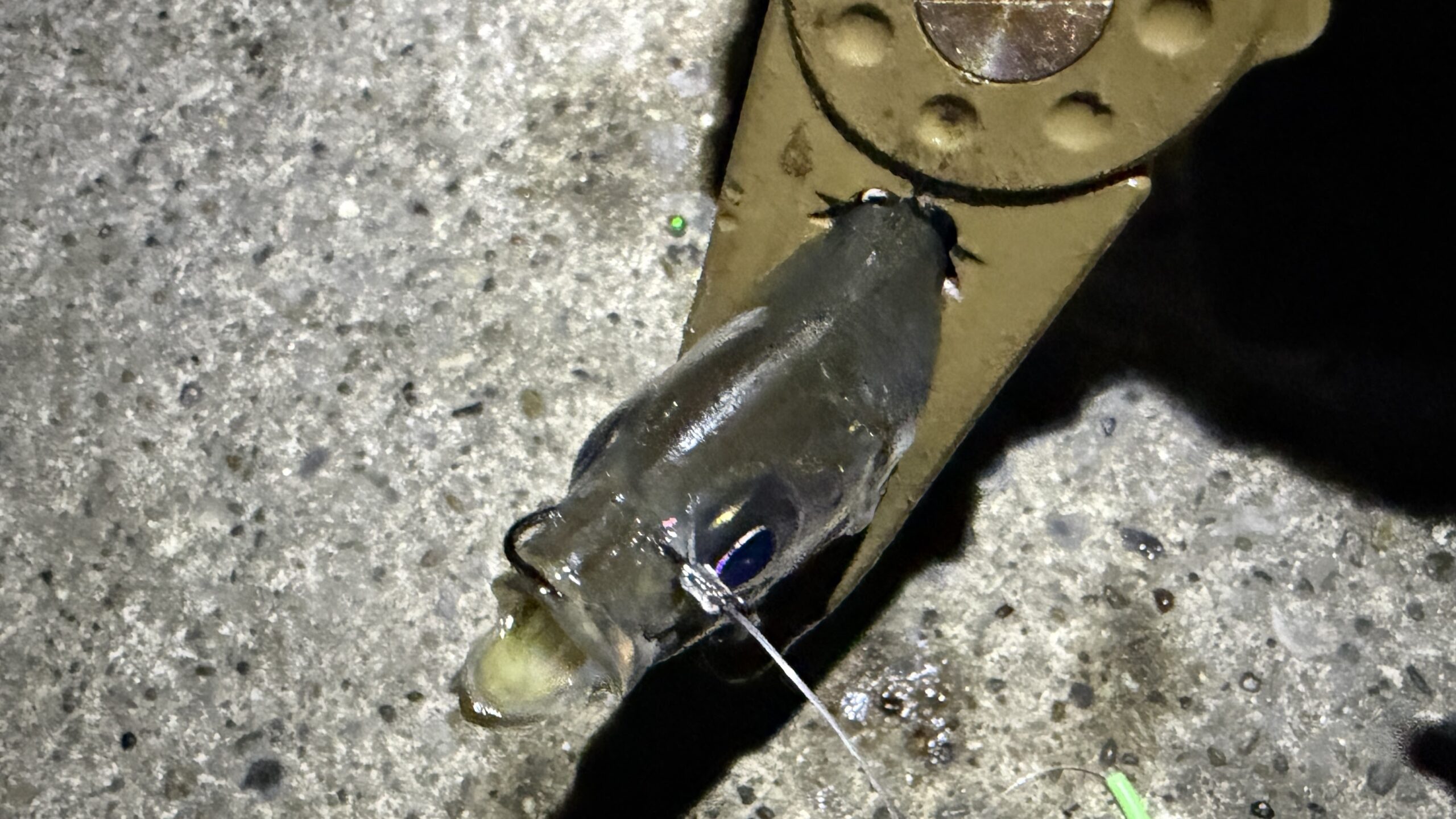 1回目、鼻がけをぶっ込んだ時、すぐにシーバスの反応が得られるも、癖で即アワセをしてしまい、アジがすっぽ抜けてしまう形となる。しっかり食わる間が必要なんだ…